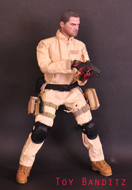 camo, a black combat boots, black knee pads a drop down thigh holster and a